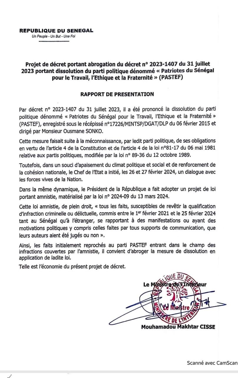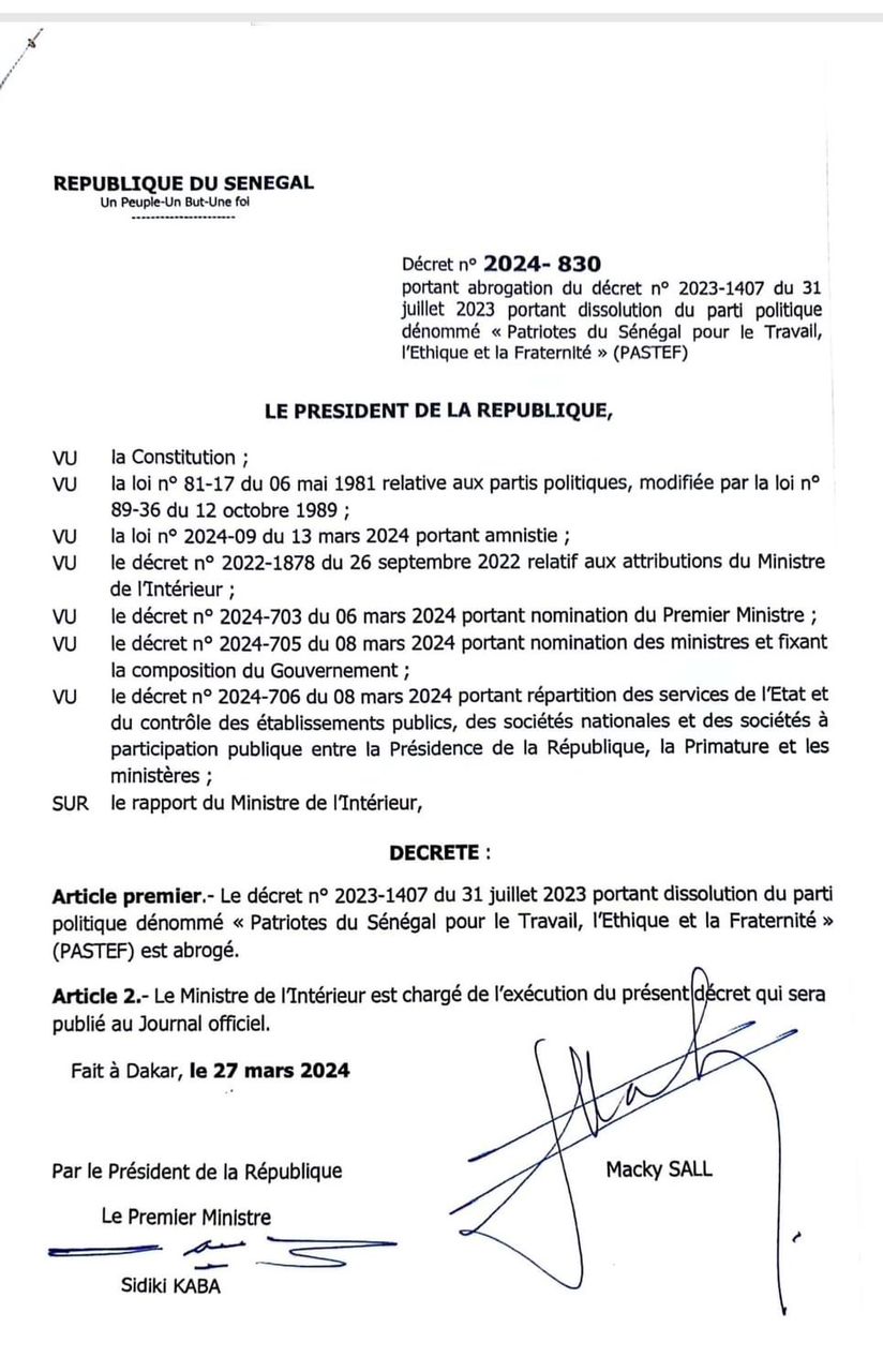 Le 27 mars 2024, Macky Sall, encore dans ses habits de Président de la République, a rétabli Pastef dans ses droits de parti politique légal huit mois après sa dissolution annoncée. Le décret d'abrogation 2024-830 a été contresigné par le premier ministre d'alors Sidiki Kaba.