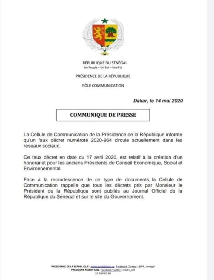 *** Le 14 mai 2020, la cellule de la Communication de la Présidence s’est fendue d’un communiqué laconique et totalement ridicule pour démentir l’existence du décret n°2020-964 instituant l’honorariat pour les anciens présidents du conseil économique, social, et environnemental ;