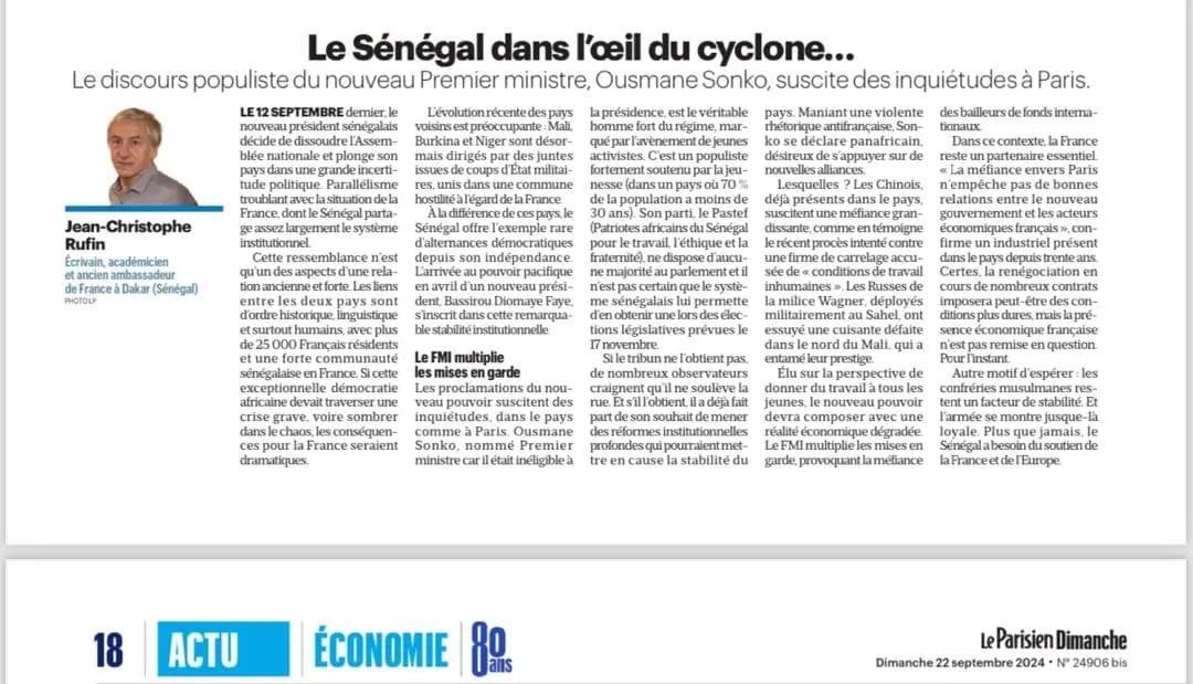 « La France à travers l'ancien ambassadeur de France à Dakar que fut Jean-Christophe Rufin a publié dans le journal Le Parisien du 22 septembre 2024 a publié une tribune intitulée:
