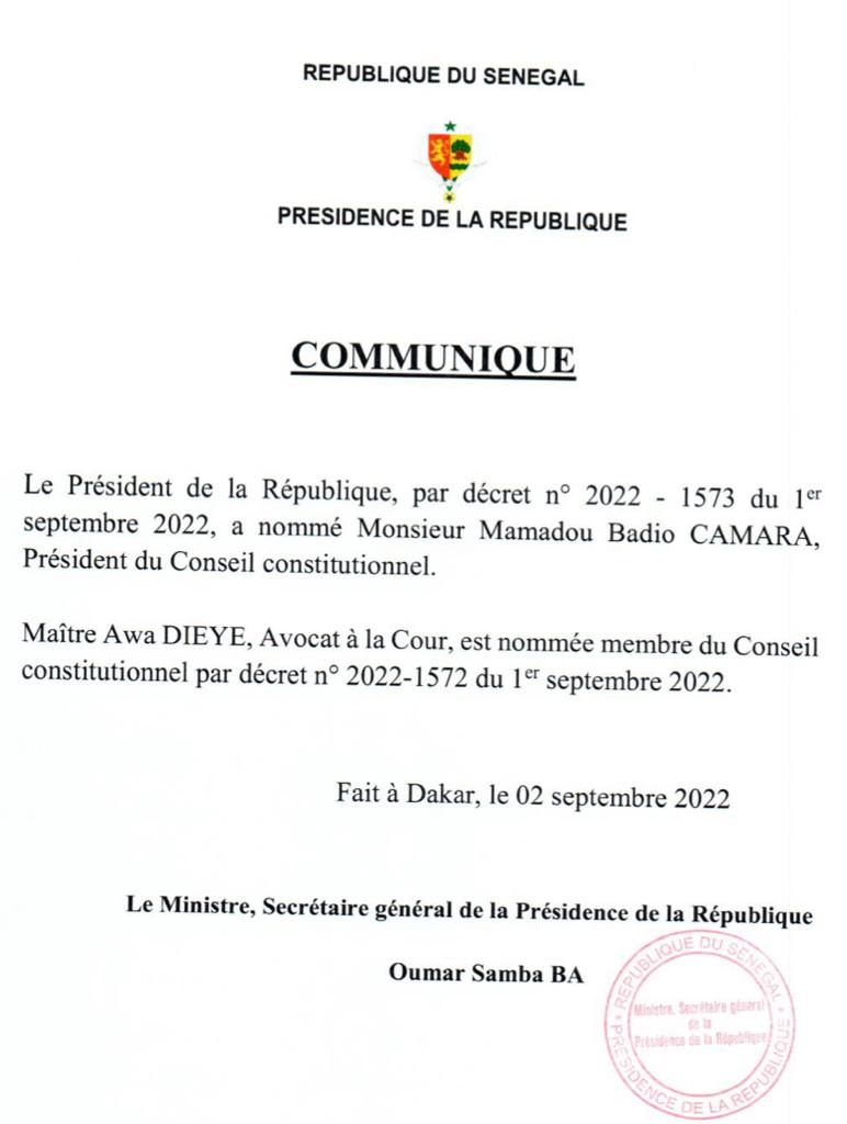 Le président de la république, par un autre décret n°2022-1572 du 1er septembre 2022, nommé l’avocate Awa Dièye membre du Conseil constitutionnel.