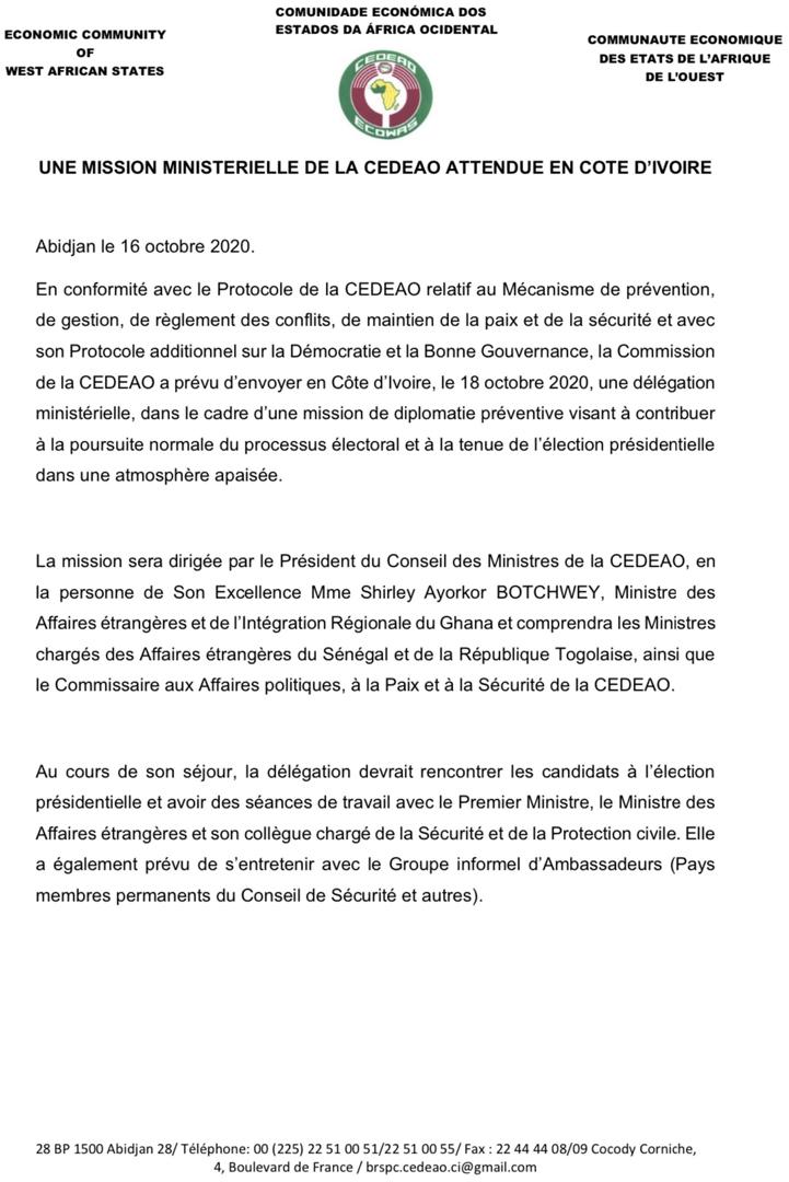 Présidentielle en Côte d'Ivoire: Une mission de la Cedeao débarque à Abidjan (voir pièce jointe)