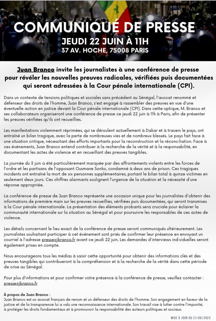 Répression au Sénégal - Juan Branco annonce de "nouvelles preuves radicales, vérifiées puis documentées" pour la CPI (conférence de presse)