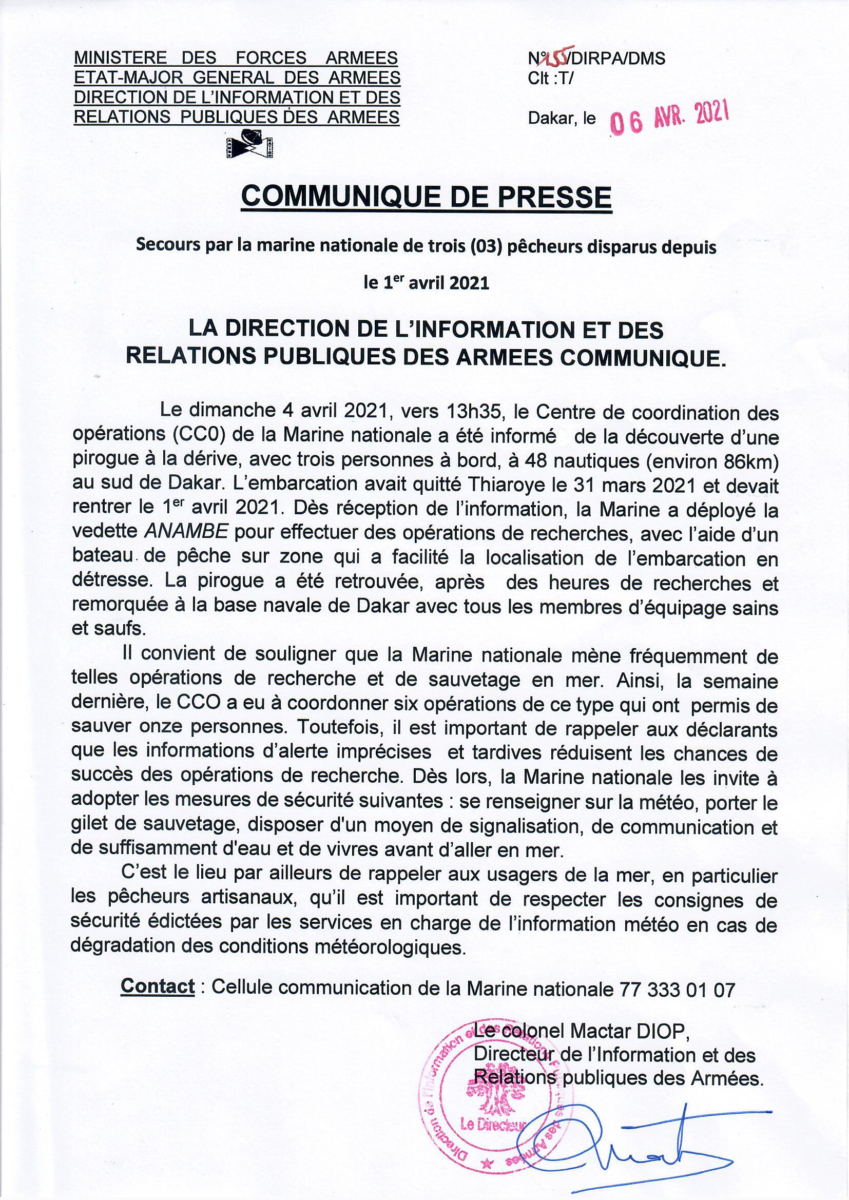 Trois pêcheurs dans une pirogue à la dérive retrouvés par la Marine nationale